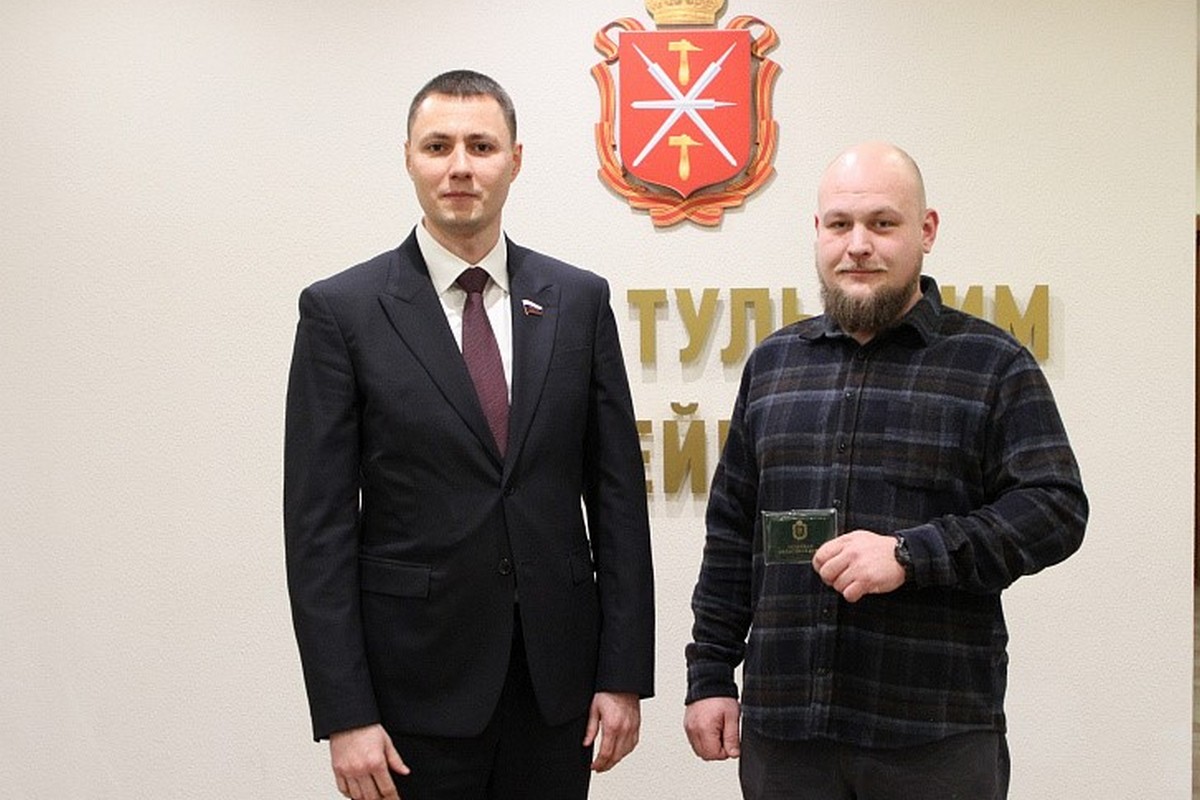 Депутат Тульской областной Думы, член фракции «Единая Россия» Андрей Тихонов вручил удостоверение общественного помощника ветерану СВО.