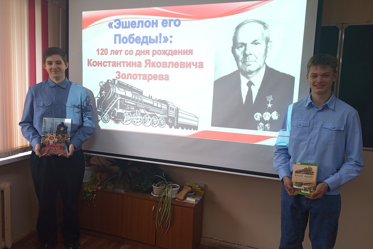 Студенты узнали о жизни и профессиональном пути выдающегося машиниста, нашего земляка Константина Золотарева, о его новаторских предложениях и заслугах. Вниманию ребят были представлены книги, брошюры, статьи из газет, видеосюжеты, рассказывающие о судьбе легендарного железнодорожника.