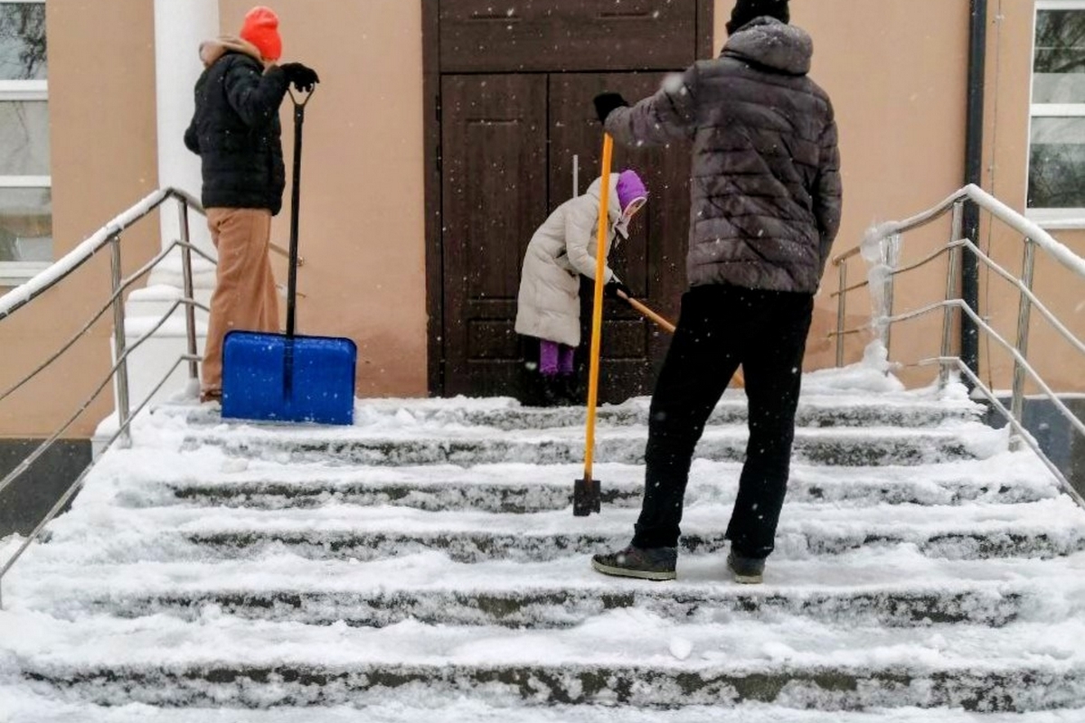 Сегодня сотрудники Дворца культуры, оставив домашние дела, объединились ради общего и важного дела — очистили территорию от снега.