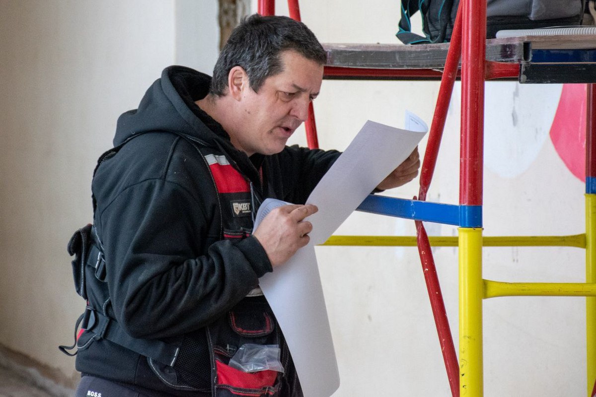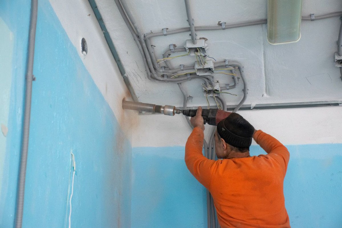Подрядчик выполняет работы по демонтажу, ремонту кровли, устройству стяжки на втором этаже и в горячем цеху первого этажа, выравниванию стен и откосов лестничных пролётов, отделке фасада, а параллельно с этим осуществляются электромонтажные работы.